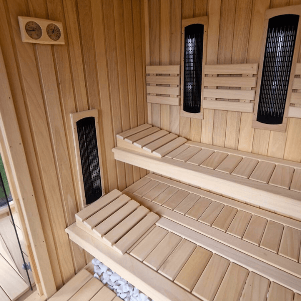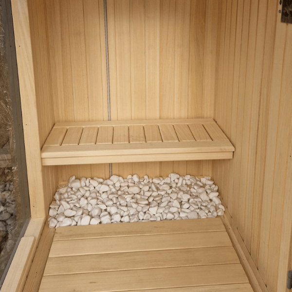 Wnętrze sauny zostało w całości wykonane z egzotycznego drewna abachi, które nie nagrzewa się nadmiernie, jest gładkie i bezpieczne w kontakcie ze skórą. Jasna kolorystyka drewna tworzy wrażenie przestrzeni, czystości i luksusu, sprzyjając głębokiemu relaksowi.